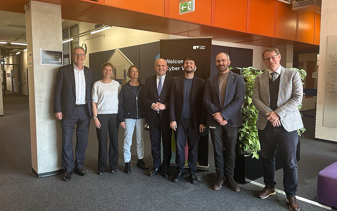 On March 30, we welcomed members of the European Parliament Ilhan Kyuchyuk, Axel Voss, Brando Benifei, and Anze Erbeznik to Cyber Valley in Stuttgart for an engaging exchange on Europe’s evolving AI landscape. Together with Regina Ammicht Quinn and Jessica Heesen from the International Center for Ethics in the Sciences and Humanities at Eberhard Karls Universität Tübingen, as well as Florian K. Mayer, CEO of Cyber Valley GmbH, they discussed key developments shaping Europe’s AI ecosystem. Topics included European AI legislation and the EU Artificial Intelligence Act, the ethical implications of AI, digital autonomy, and questions surrounding our digital afterlife.